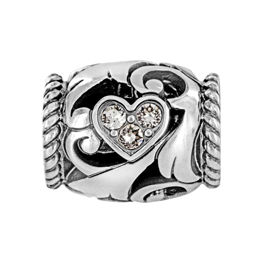 A sparkling trio of fine quality crystals rests within a heart set against the distinctive Kaytana scroll, inspired by lace worn by the Duchess of Alba. Pair this bead with any other from our collections!